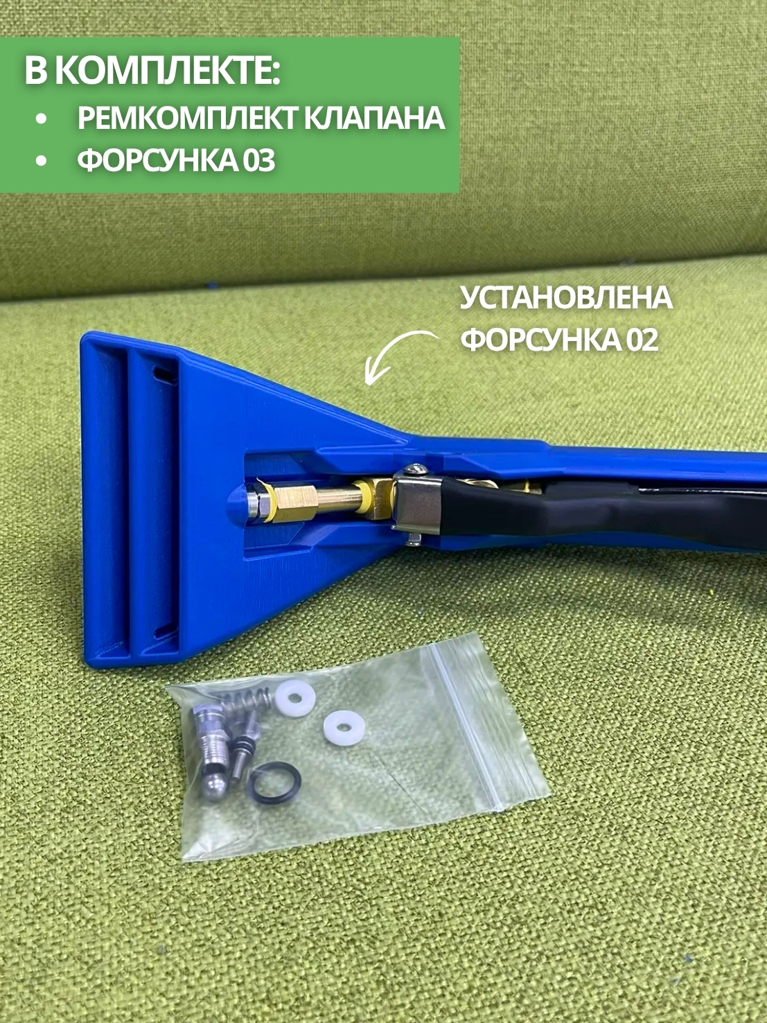 Установлена 02 форсунка, в комплекте запасное стекло, ремкомплект клапана, форсунка 03.
