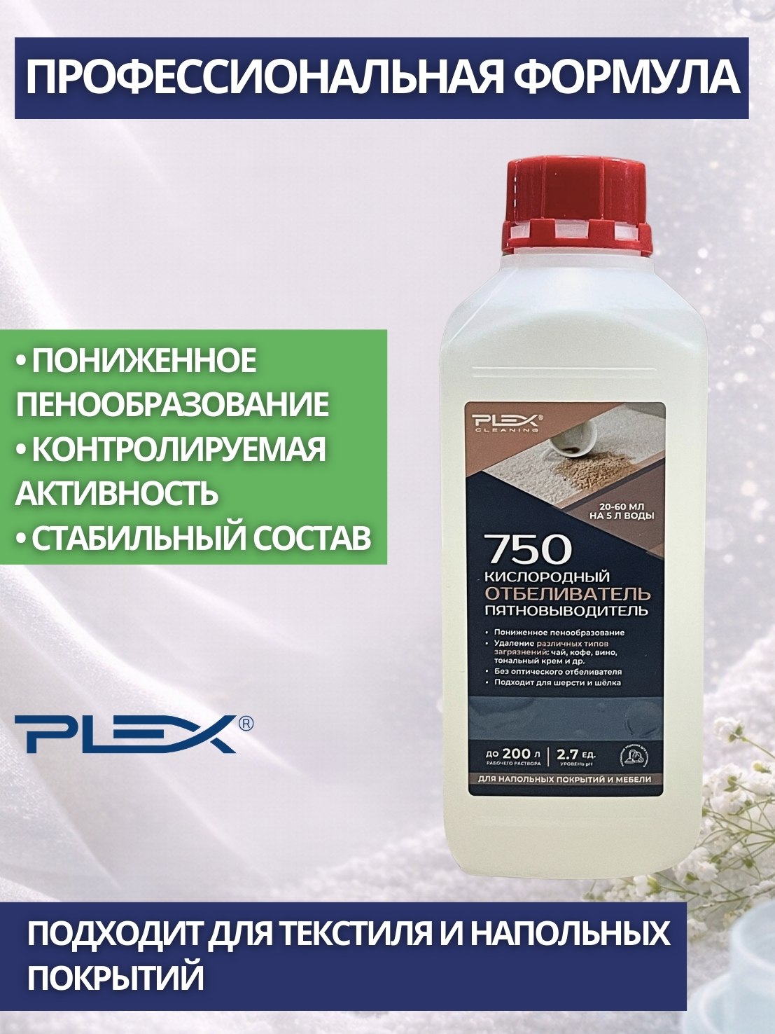 Специальный пятновыводитель-отбеливатель для проведения клининговых работ на текстильных изделиях и напольных покрытиях. Обладает сильным действием против широкого спектра пятен танинного происхождения, косметики, вина, некоторых пигментных загрязнений и многих других. имеет среднее пенообразование и не содержит оптического отбеливателя. Имеет стабилизированный состав для долгого хранения.