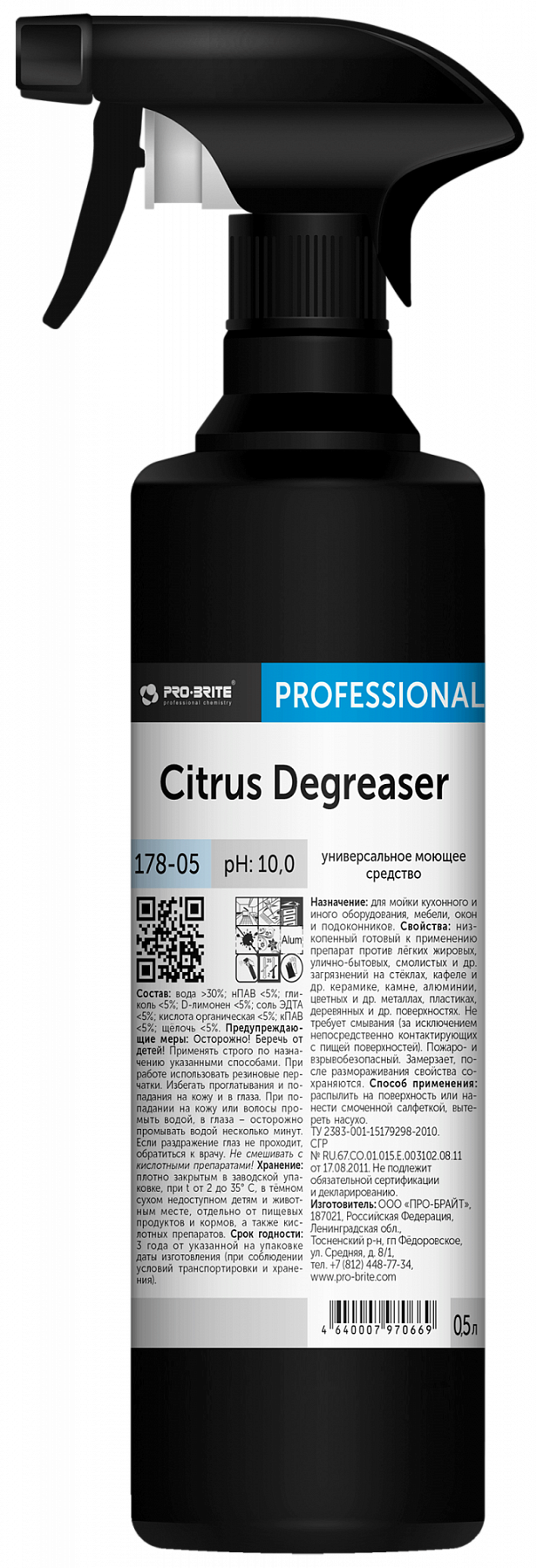 Pro-Brite: Citrus Degreaser 0,5л/12шт триггер Универсал. моющее ср-во, готовый к применению препарат