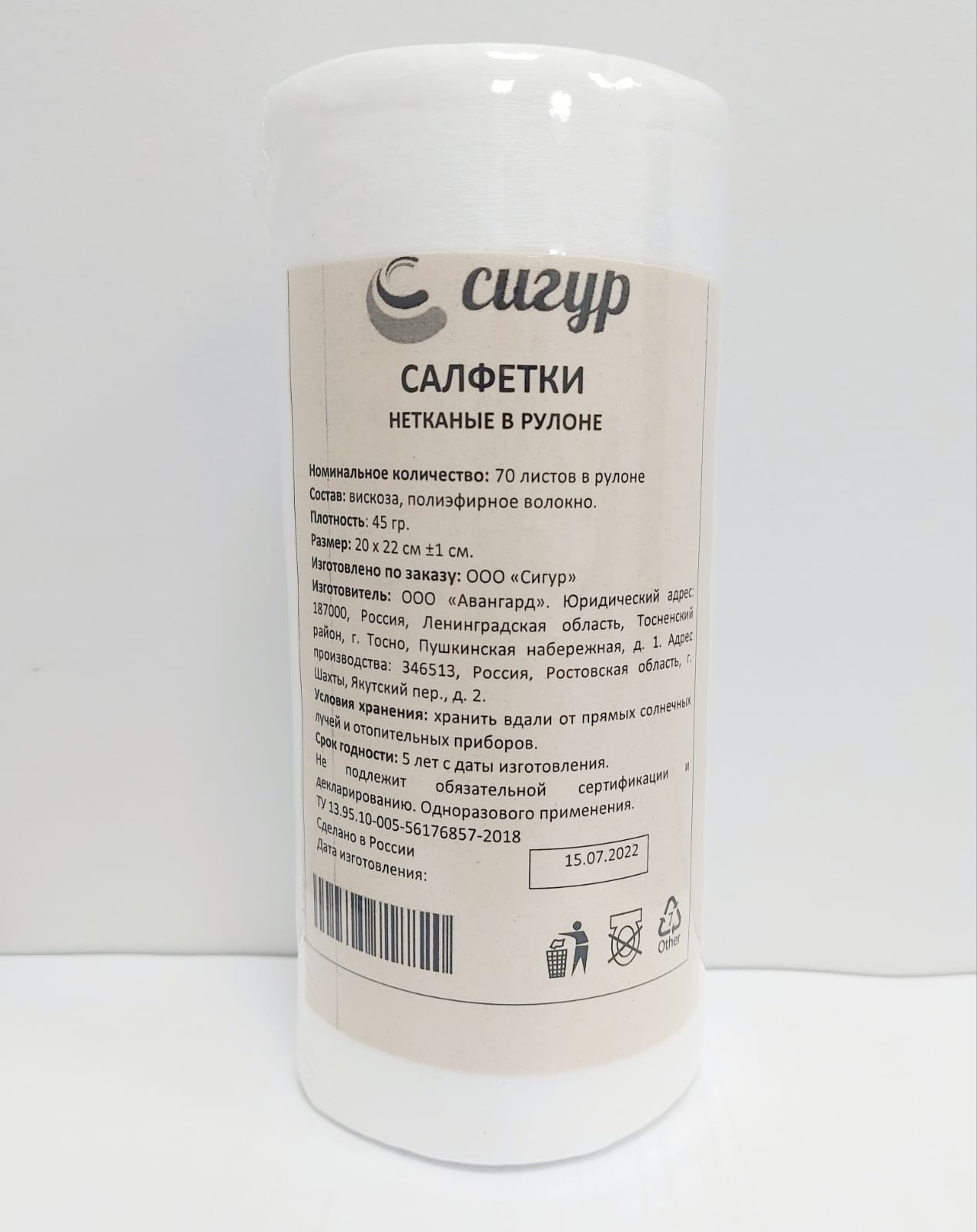 Салфетка нетканая Сигур в рулоне, 70 листов, 20*22см вискоза 45 гр/м2