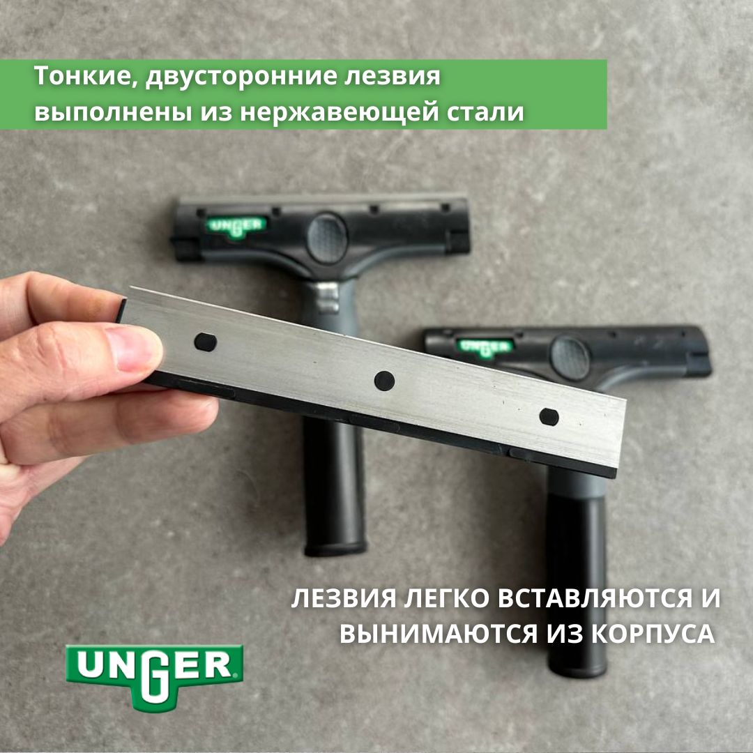 Специальная кнопка позволяет изменять рабочий угол от 0° до 30°. Тонкие, двусторонние лезвия выполнены из нержавеющей стали, обеспечивающие непревзойденную остроту режущей кромки в течение долгого времени. Лезвия съемные: легко вставляются и вынимаются из корпуса. Новейший сверхнадежный механизм смены лезвий, гарантирующий защиту рук от порезов. Защитный пластиковый чехол, обеспечивающий безопасность при хранении. Совместим с телескопическими штангами Unger. Скребок используется со стальными лезвиями арт. ENB15.
